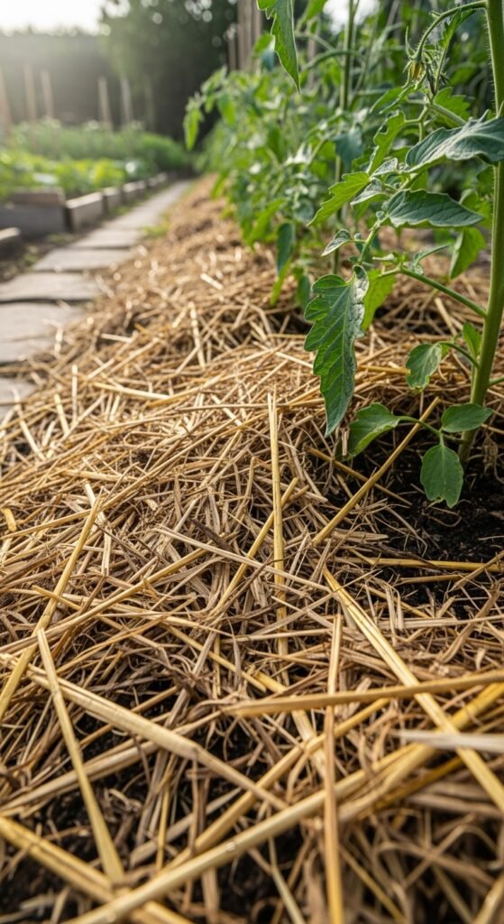 You should apply a 2-3 inch layer of organic mulch around tomato plants after the soil warms. Materials like straw, wood chips, or shredded leaves conserve moisture, suppress weeds, and regulate soil temperature.