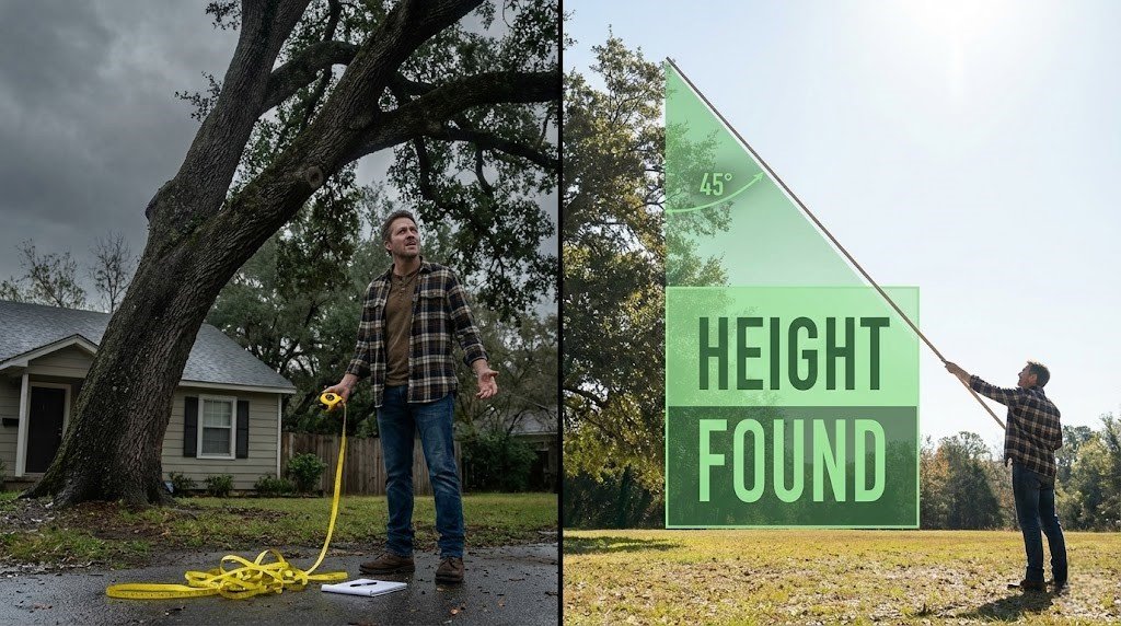Use our Tree Height Estimator to calculate the vertical height and determining the “Drop Zone” safety radius before you start cutting.
