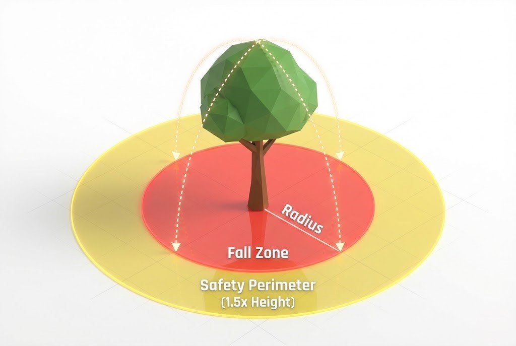 Our tool automatically calculates a safety perimeter (1.5x height) so you can clear the area of cars, pets, and people before any chainsaw work begins.