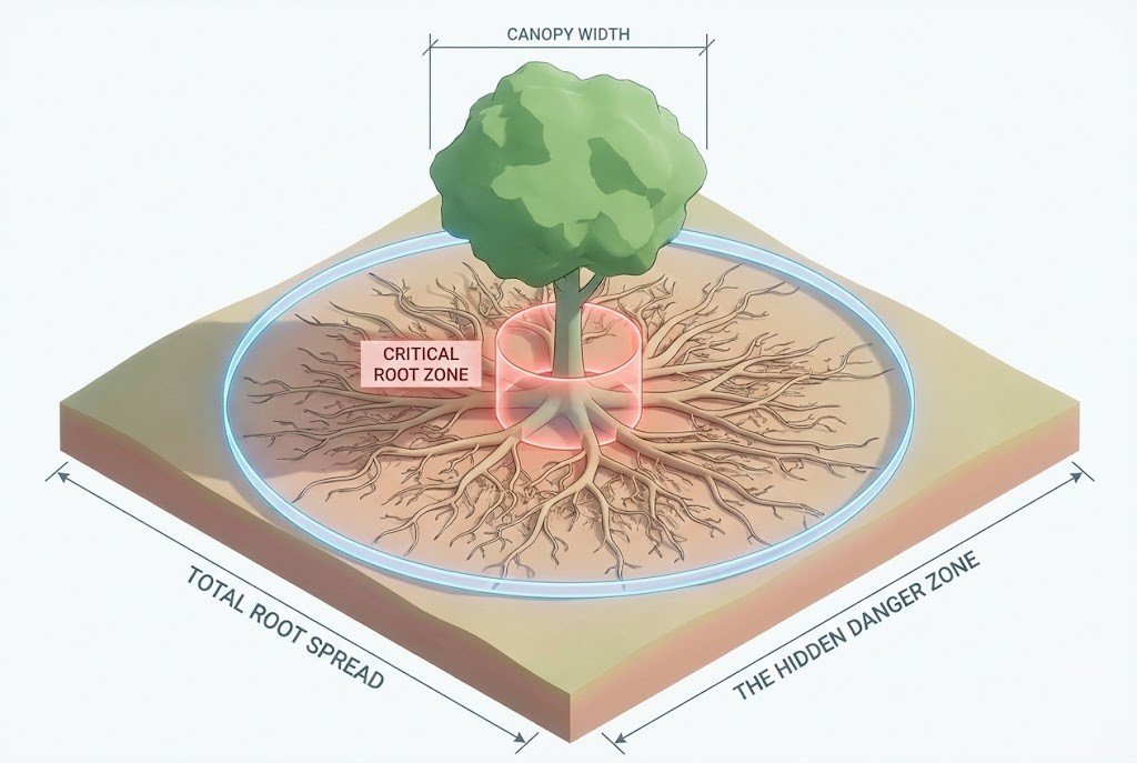 ⚠️ Damage Threshold: If you cut >25% of the roots within this zone, the tree will likely decline and die within 2-5 years.
