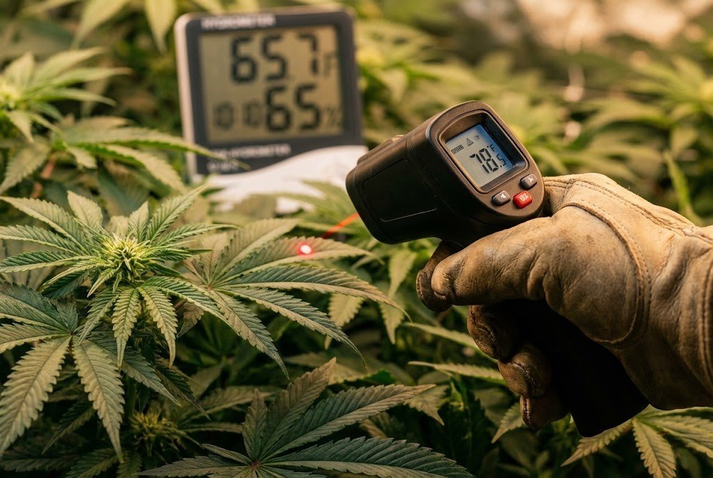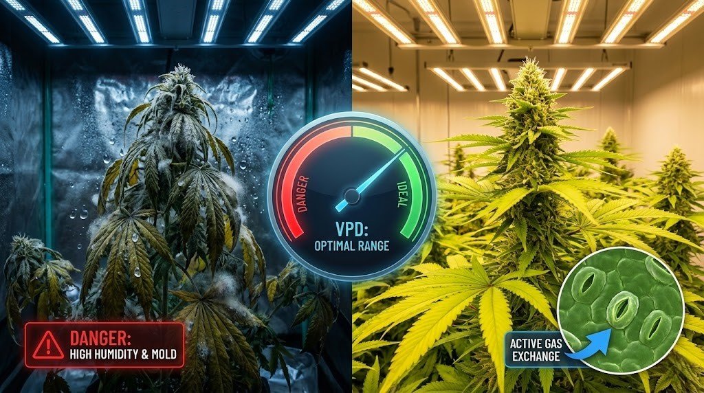• Low VPD (Too Humid): The air is so saturated with water that the plant cannot sweat. This leads to calcium deficiencies (tip burn) and creates a breeding ground for powdery mildew and botrytis.