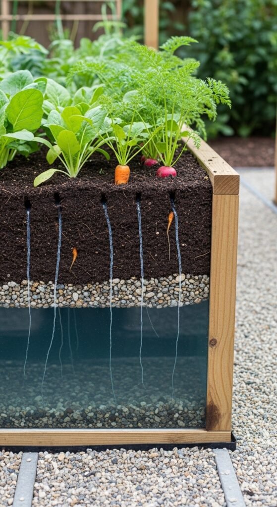 You construct wicking beds with reservoirs beneath soil, drawing moisture upward via capillary action. Wicking bed designs provide consistent hydration with minimal intervention.