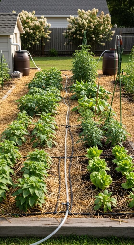 You spread organic mulch around your vegetables to retain soil moisture and suppress weeds. Materials like straw or wood chips create a barrier that slows evaporation and moderates soil temperature. Mulching vegetable garden practices integrate seamlessly with watering routines.