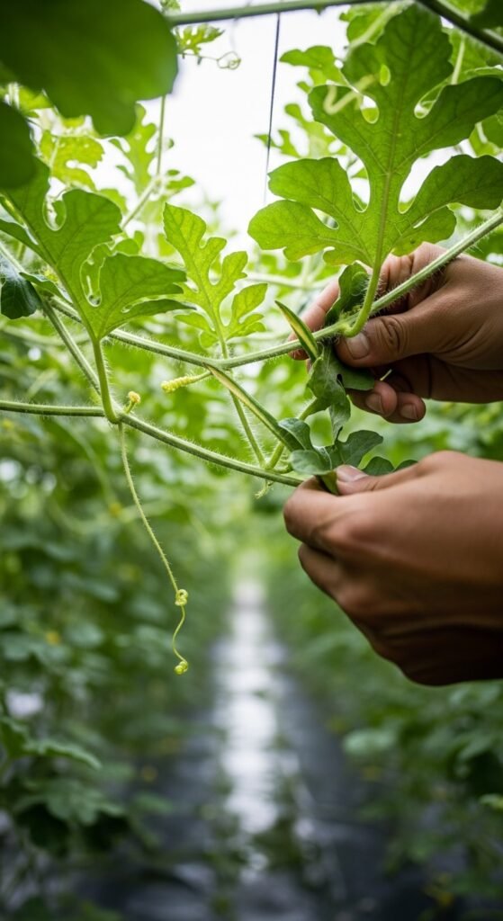 You incorporate training as part of pruning by guiding watermelon vines onto supports like trellises, combining structure with selective cuts. This elevates fruits, improves air flow, and makes pruning easier. Why? It prevents ground contact, reducing rot and pest issues for cleaner, larger melons.