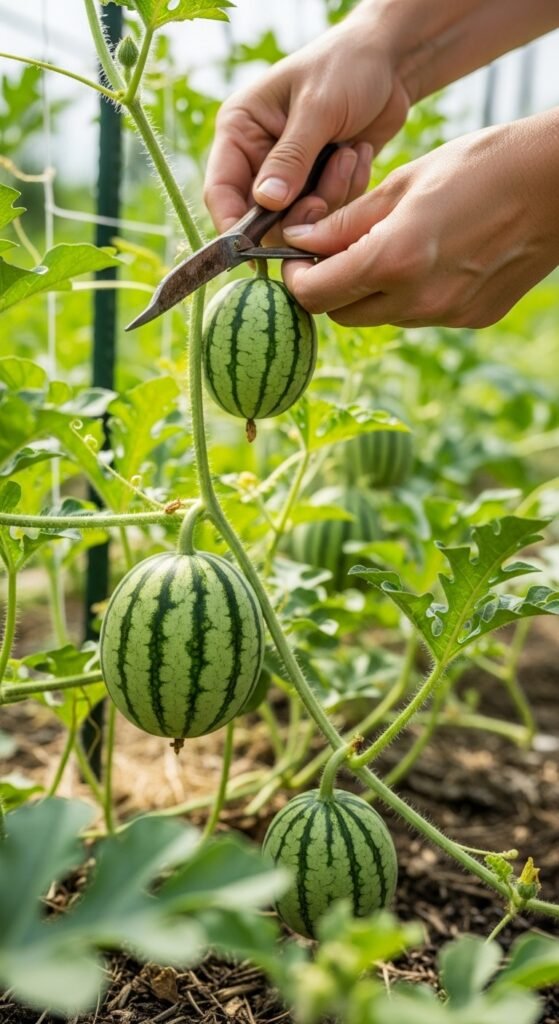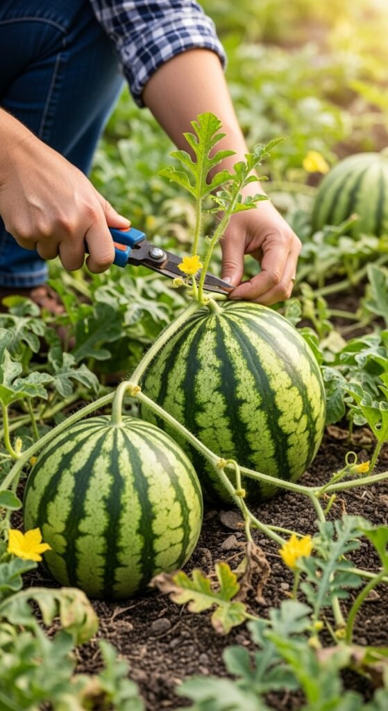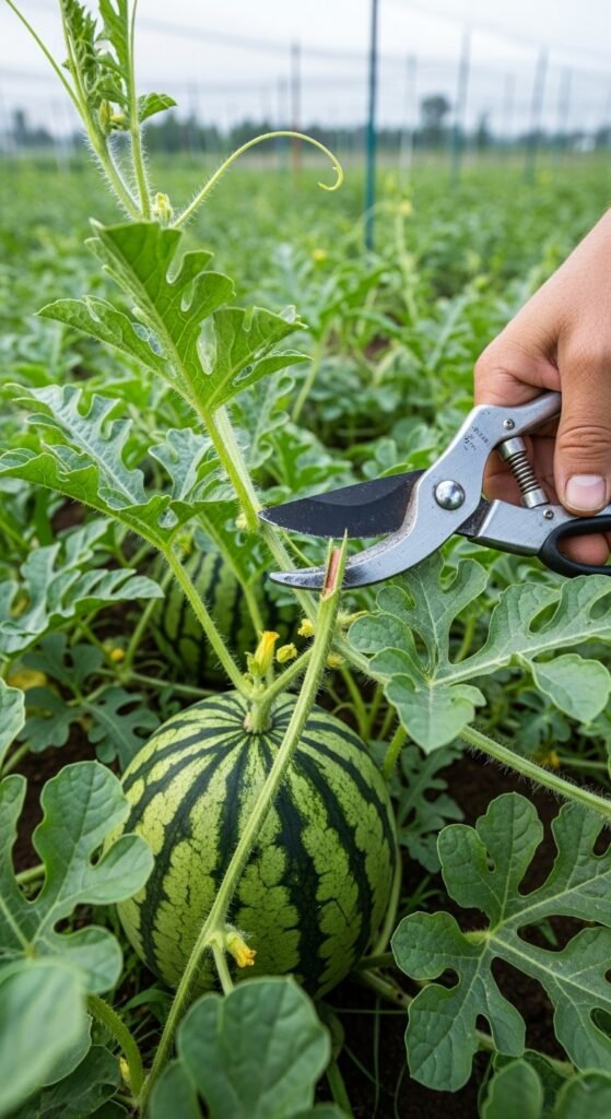 Once your watermelons have set and begun to swell, you prune away any new growth beyond the fruit-bearing sections. This directs nutrients straight to the developing melons, boosting size and sweetness while preventing vine sprawl. The benefit? It minimizes shading and improves sunlight penetration, reducing rot risks.