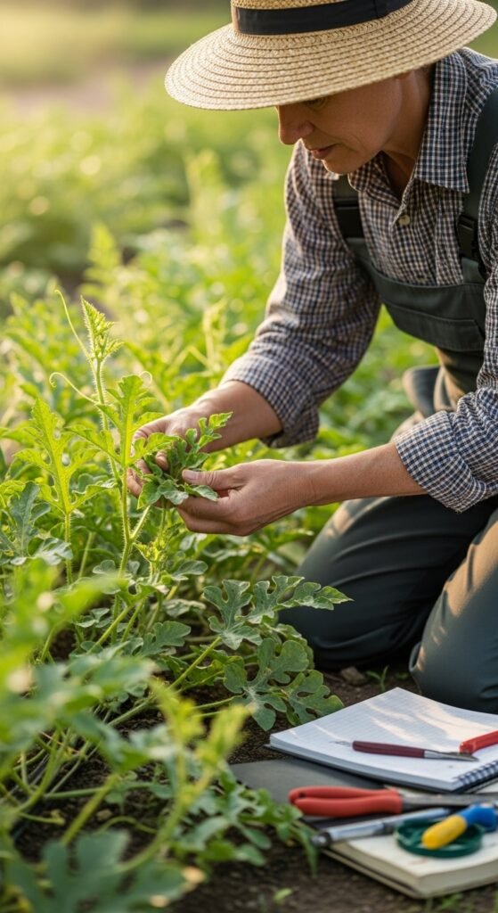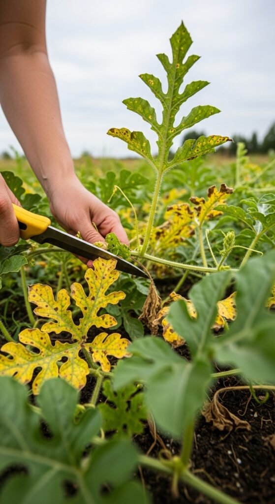 You promptly prune away any yellowed, spotted, or damaged foliage to halt disease spread and maintain plant vitality. This targeted removal keeps your watermelons healthy, focusing energy on fruit rather than repair. The key benefit is early intervention, preventing widespread issues that could decimate your crop.