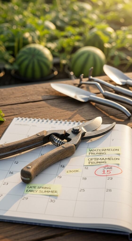 You schedule your watermelon pruning for early morning when dew has dried but before the heat intensifies. This timing allows wounds to heal quickly in the day’s warmth, reducing infection risks and stress on the plant. The advantage? Healthier vines with better resilience against pests and environmental pressures.