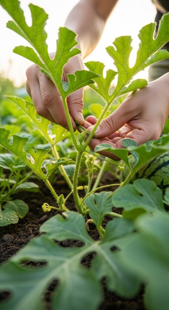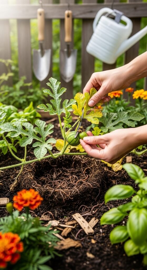 You prune watermelons in tandem with companion plants to create a balanced ecosystem that deters pests and enhances growth. Planting marigolds or nasturtiums nearby and pruning them lightly keeps the area tidy and beneficial. The why: Companions repel insects naturally, reducing chemical needs while pruning maintains harmony.