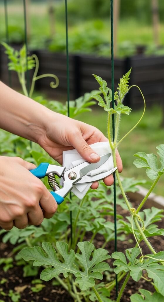 You always sterilize your shears or knives before pruning to prevent spreading diseases like fungal infections across your watermelon patch. Why prioritize this? Clean tools safeguard plant health, ensuring your efforts lead to robust growth rather than setbacks from pathogens.
