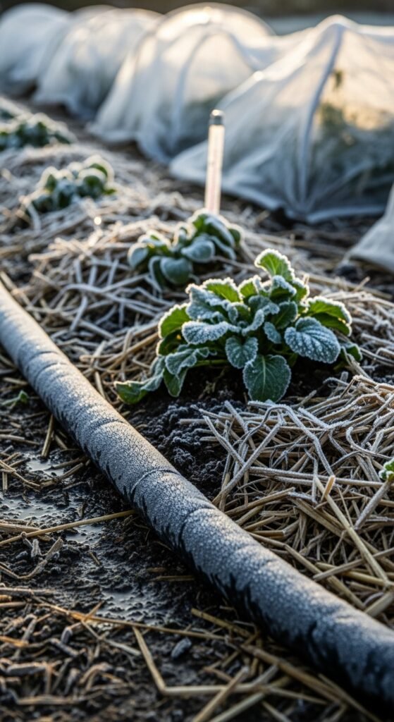 Employ row covers, cold frames, or mulch to insulate plants, and water the soil before a freeze to release heat as it solidifies.