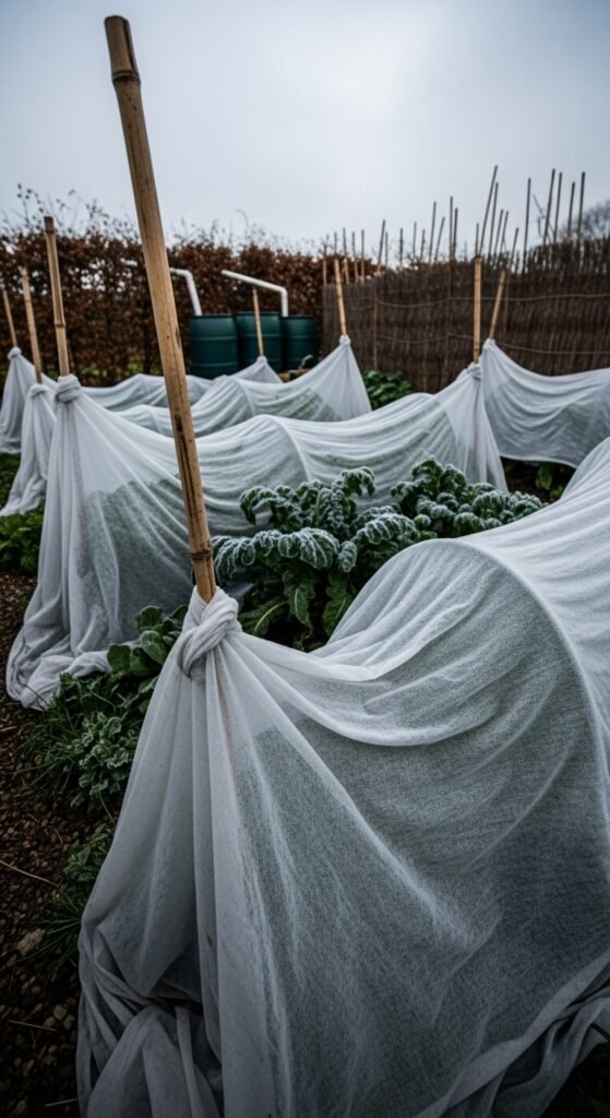 Row covers serve as lightweight fabric barriers that insulate plants while permitting light and moisture penetration. You can drape them over hoops or directly on crops to create a protective layer against frost, pests, and debris during winter vegetable gardening.