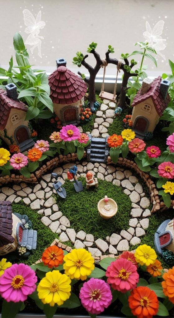 Add zinnias to fairy gardens for whimsical pops of color among miniatures. Use small varieties for scale. This sparks imagination and delights children. Zinnias fit the magical theme.