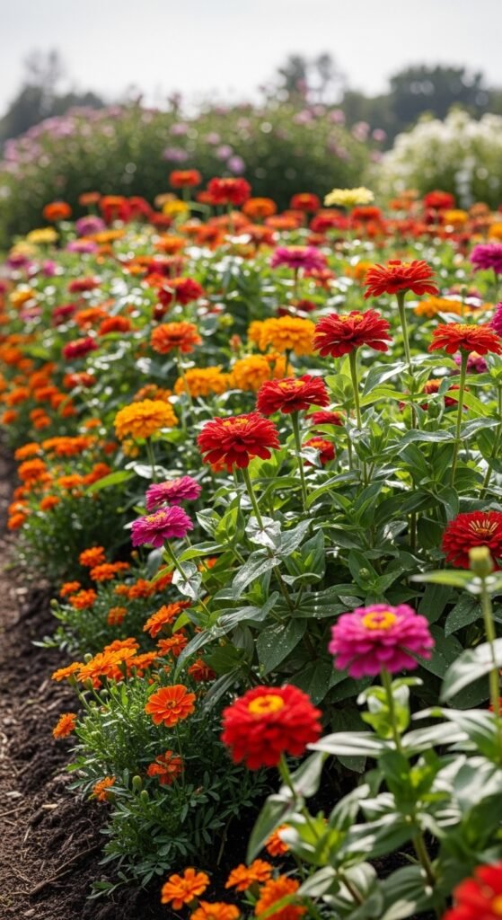 Pair zinnias with vegetables like tomatoes or cucumbers to deter pests and attract pollinators. Their bright flowers lure beneficial insects while masking scents that attract harmful ones. This natural approach boosts your garden’s health and yield without chemicals. Zinnias thrive alongside many crops, enhancing biodiversity.