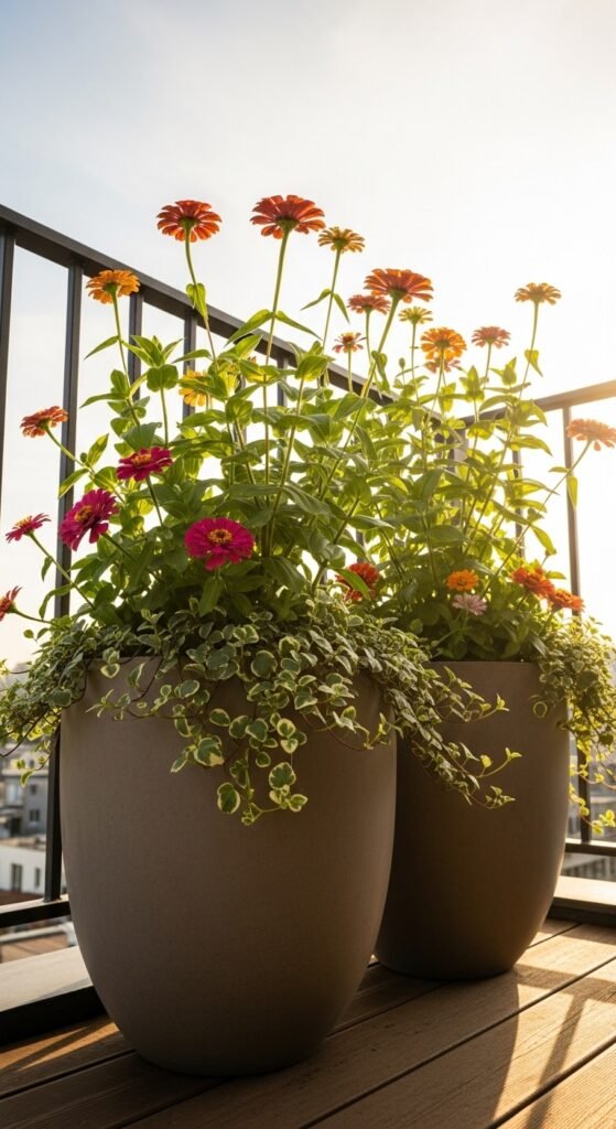 Bring zinnias to your patio or balcony with container planting, where you can control soil and placement for optimal growth. Opt for large pots with good drainage to prevent root rot, and fill them with a mix of potting soil and perlite. Containers allow you to move zinnias around for the best sunlight, ensuring vibrant blooms all summer long. They’re perfect for small spaces or urban gardens lacking ground area.