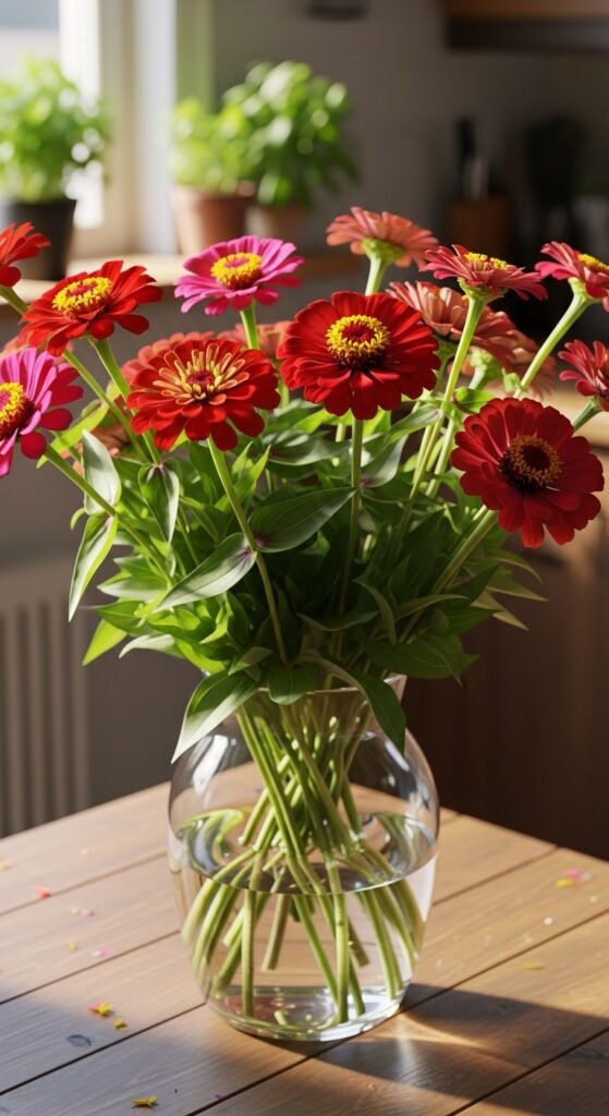 To maximize vase life, strip lower leaves and place in clean water with floral preservative. Change the water every couple of days. For a dedicated setup, plant in rows spaced 12 inches apart for easy access. Explore cut flower garden techniques to pair zinnias with dahlias or snapdragons. This idea not only beautifies your home but also promotes continuous flowering in the garden, keeping your beds tidy and productive.