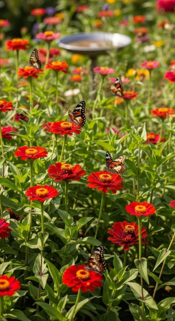 Design a butterfly haven by clustering zinnias in groups of the same color to attract these pollinators. Include nectar-rich varieties in reds, pinks, and oranges for maximum appeal. Butterflies will flock to your garden, adding movement and life while aiding pollination. Zinnias’ flat blooms provide easy landing spots.