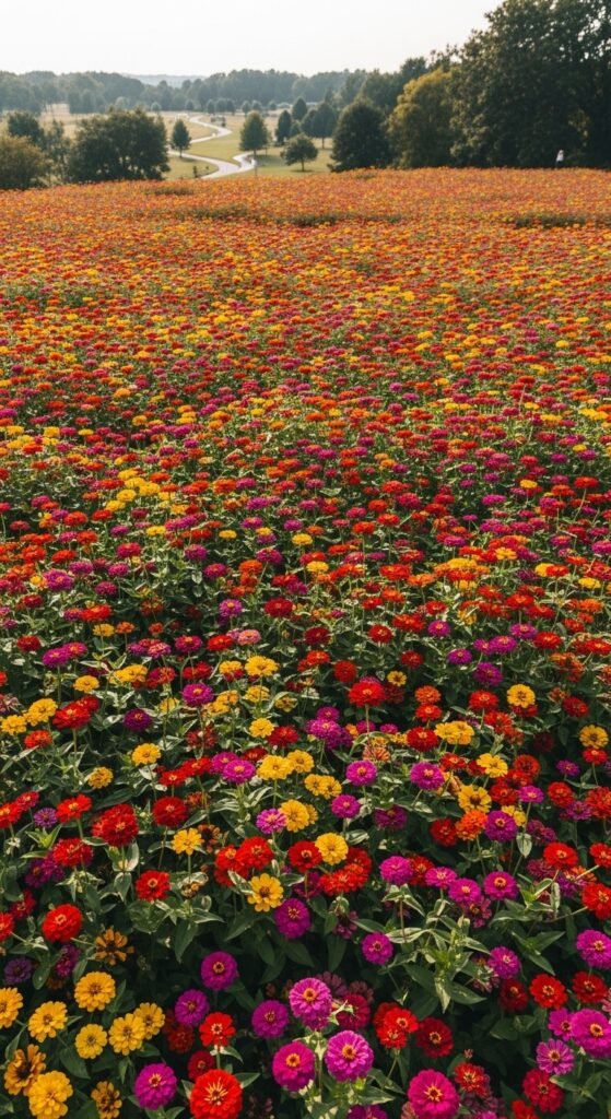 Cover large areas with dense zinnia plantings for a bold, colorful statement. Sow seeds directly in prepared beds for a sea of blooms that suppress weeds naturally. This low-effort technique delivers high impact, filling your yard with vibrant hues. Mass plantings create a meadow-like feel.
