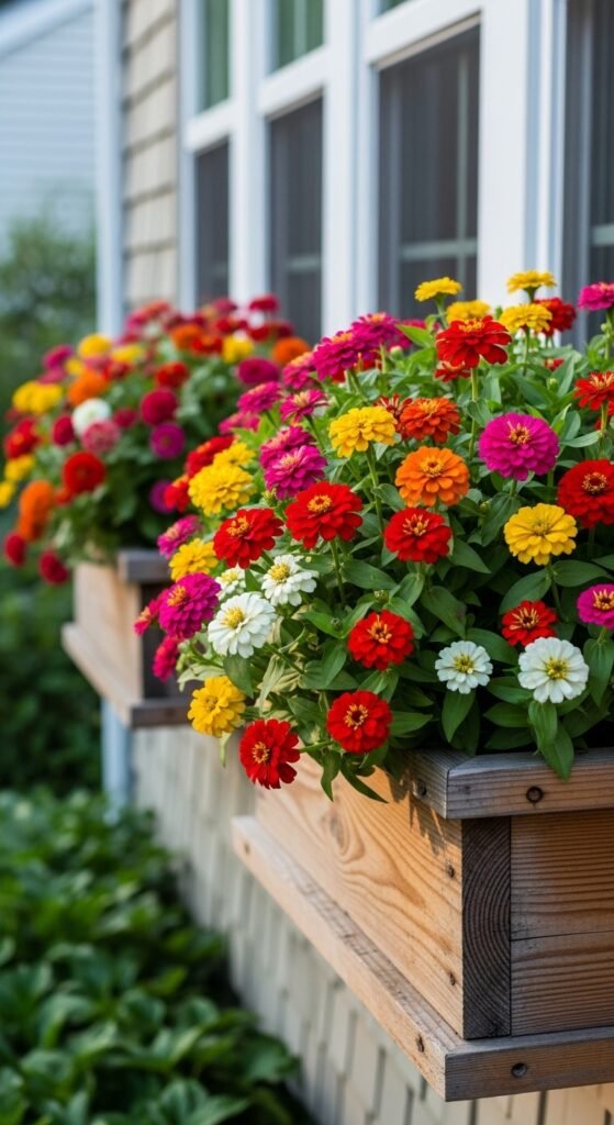 Adorn your windows with zinnia-filled boxes for curb appeal and indoor views. Use dwarf varieties to fit compact spaces, mixing colors for variety. This elevates your home’s exterior while bringing nature closer inside. Window boxes add charm without ground commitment.