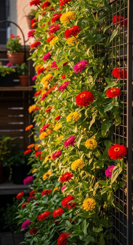 Use trellises or fences to grow climbing zinnia varieties vertically, saving space and adding height. Train stems upward for a living wall of color. This maximizes small areas and creates privacy screens. Vertical zinnias add architectural interest.