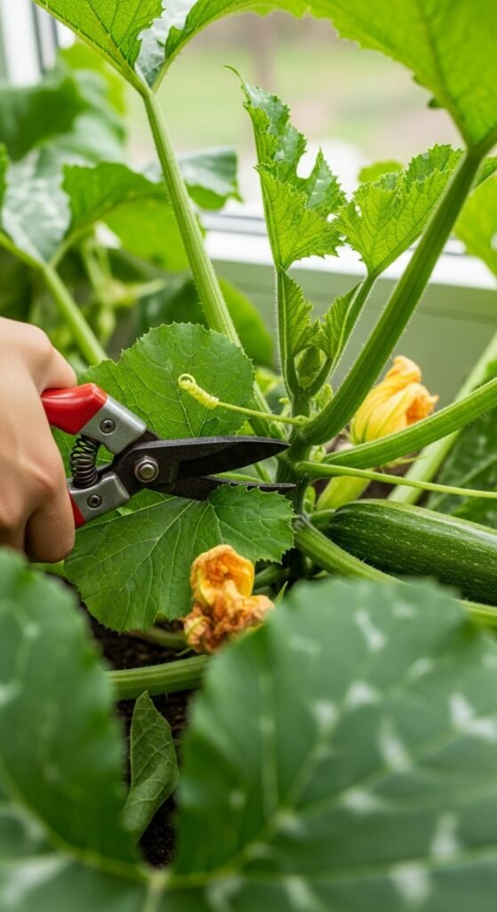 Prune zucchini and squash vines strategically. What removes excess leaves and suckers. Why helpful: Directs energy to fruits, improving size and quantity.