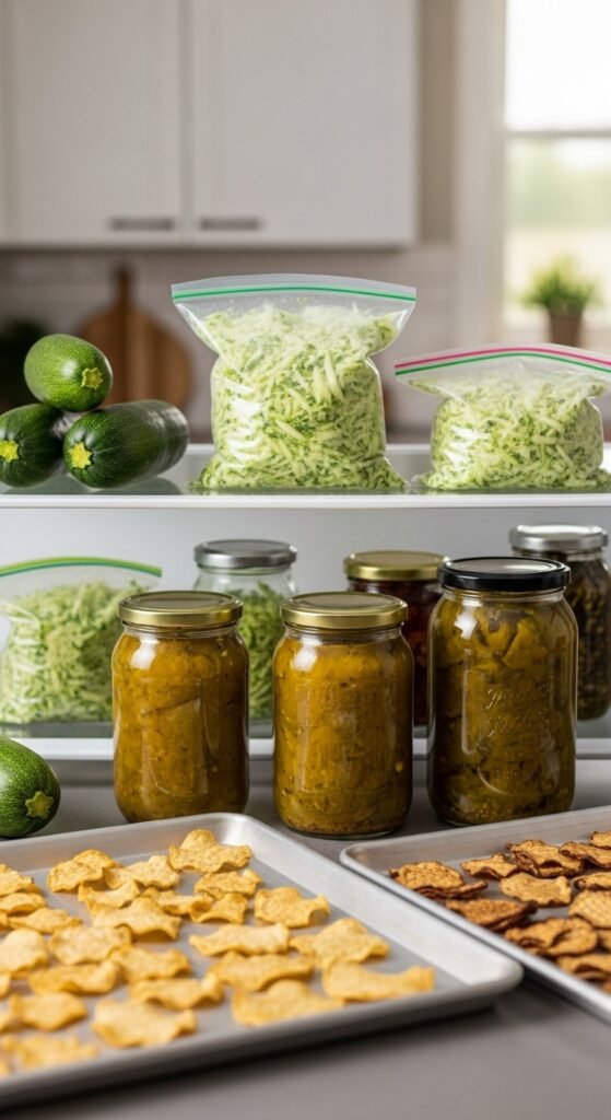 How: Freeze shredded zucchini, or can relishes. Try canning zucchini relish or dehydrate zucchini chips for snacks. For winter types, cure properly drawing from curing winter squash.