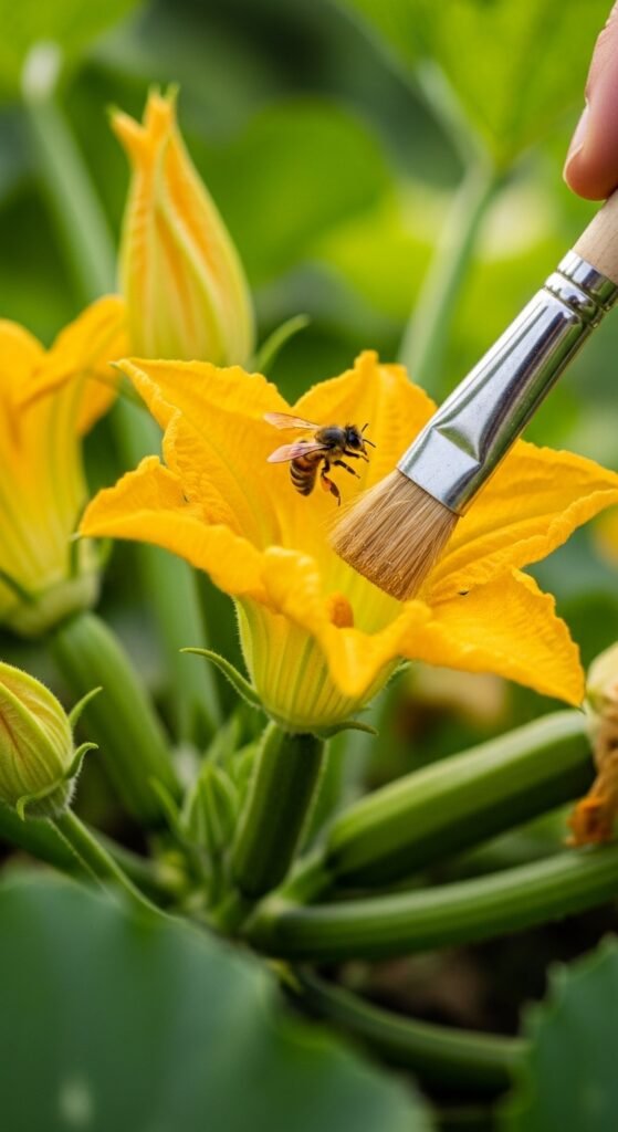 Encourage pollinators by planting flowers nearby. Hand-pollinate if needed by transferring pollen from male to female flowers for better fruit set.